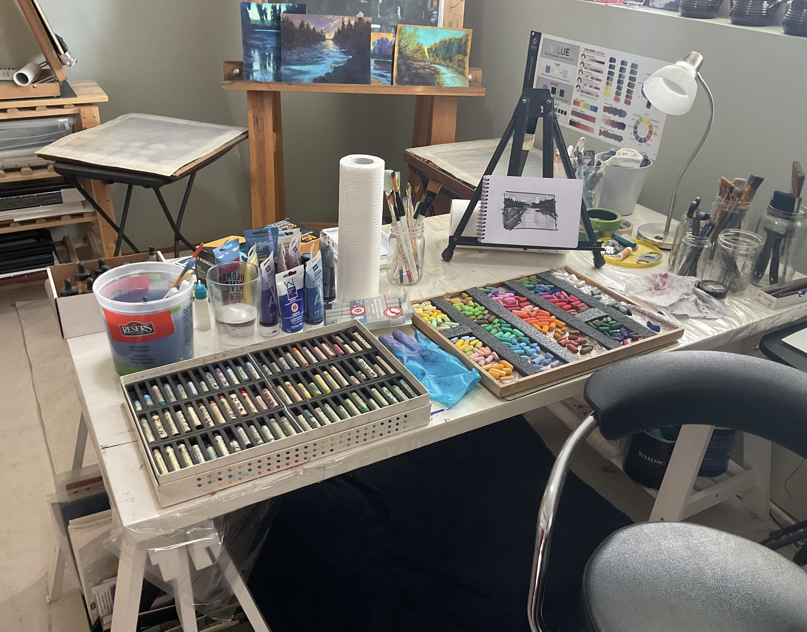 “How do I make a painting? The first step is by taking large amounts of photos on my hikes and drives around Southern Alberta . I am fortunate that I can just walk out on my back yard deck and see those beautiful mountains and expansive skies up close. My painting has transitioned primarily to using pastels as I love colour range, how transportable and immediate they are. Most of what I paint is either from quick on location sketches or compositions I create from many photos pieced together. Often what I paint is nothing what I saw when the photograph or sketch was created. Using my imagination and my memory of a place often weighs heavier in my approach to the painting”.